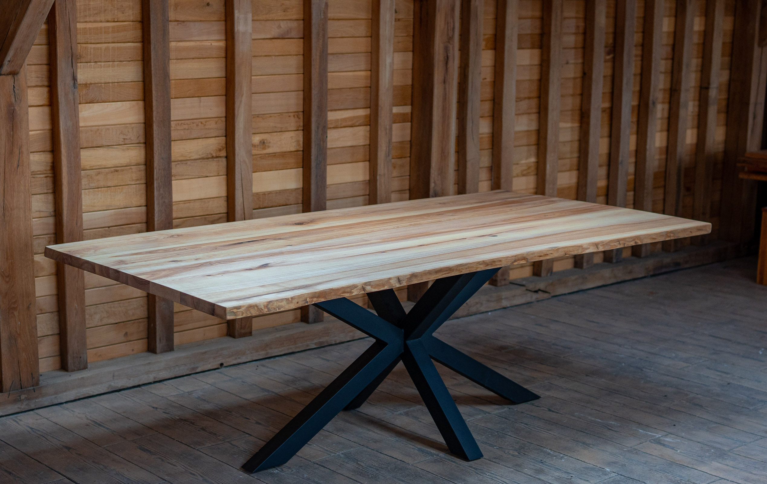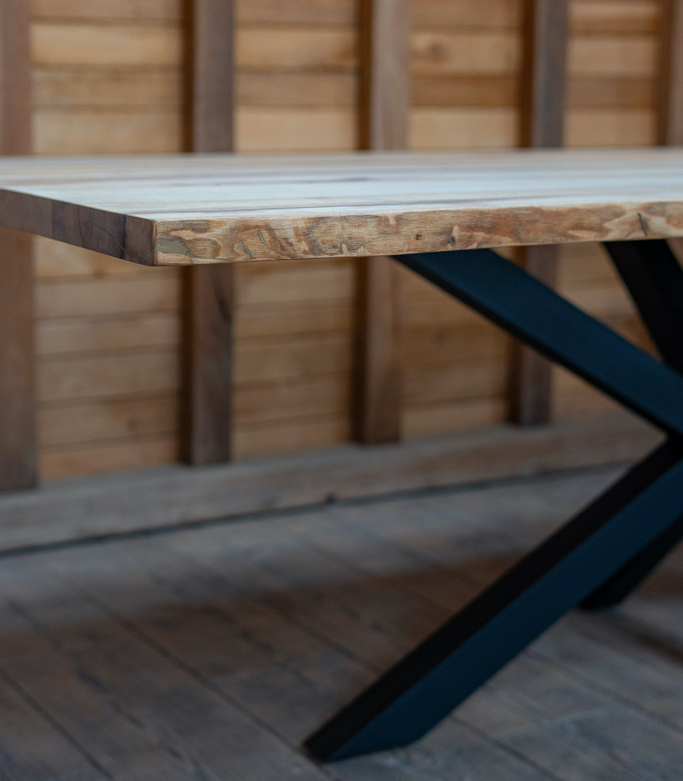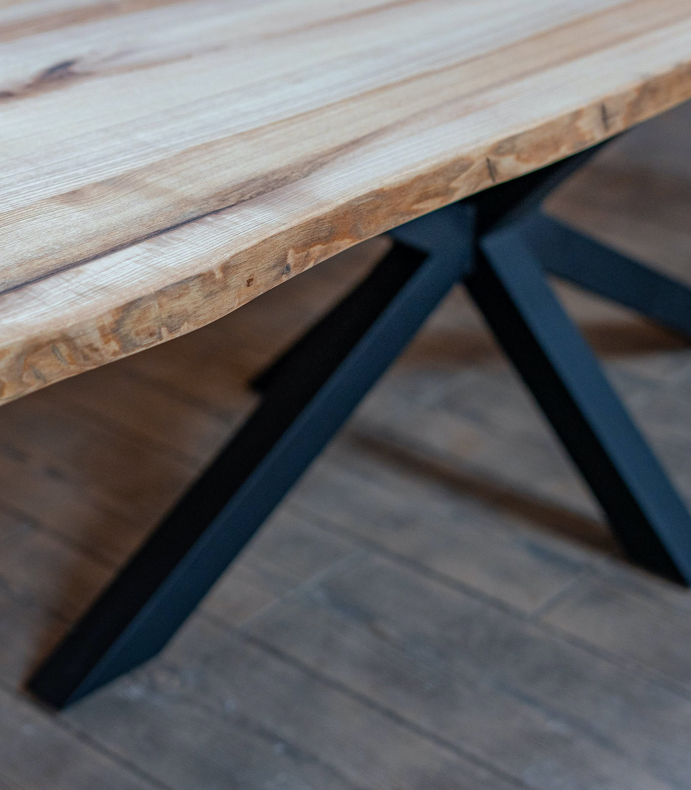 Fiecare masă este o piesă de artă unică. Marginile naturale (live edge) urmăresc linia originală a copacului, aducând o bucată din natură direct în casa ta. Pentru a susține greutatea considerabilă a blatului de 4 cm grosime, am dotat această masă cu baza metalică Model Spider, vopsită în câmp electrostatic negru mat, ce oferă un contrast modern și o libertate de mișcare totală pentru picioarele oaspeților.