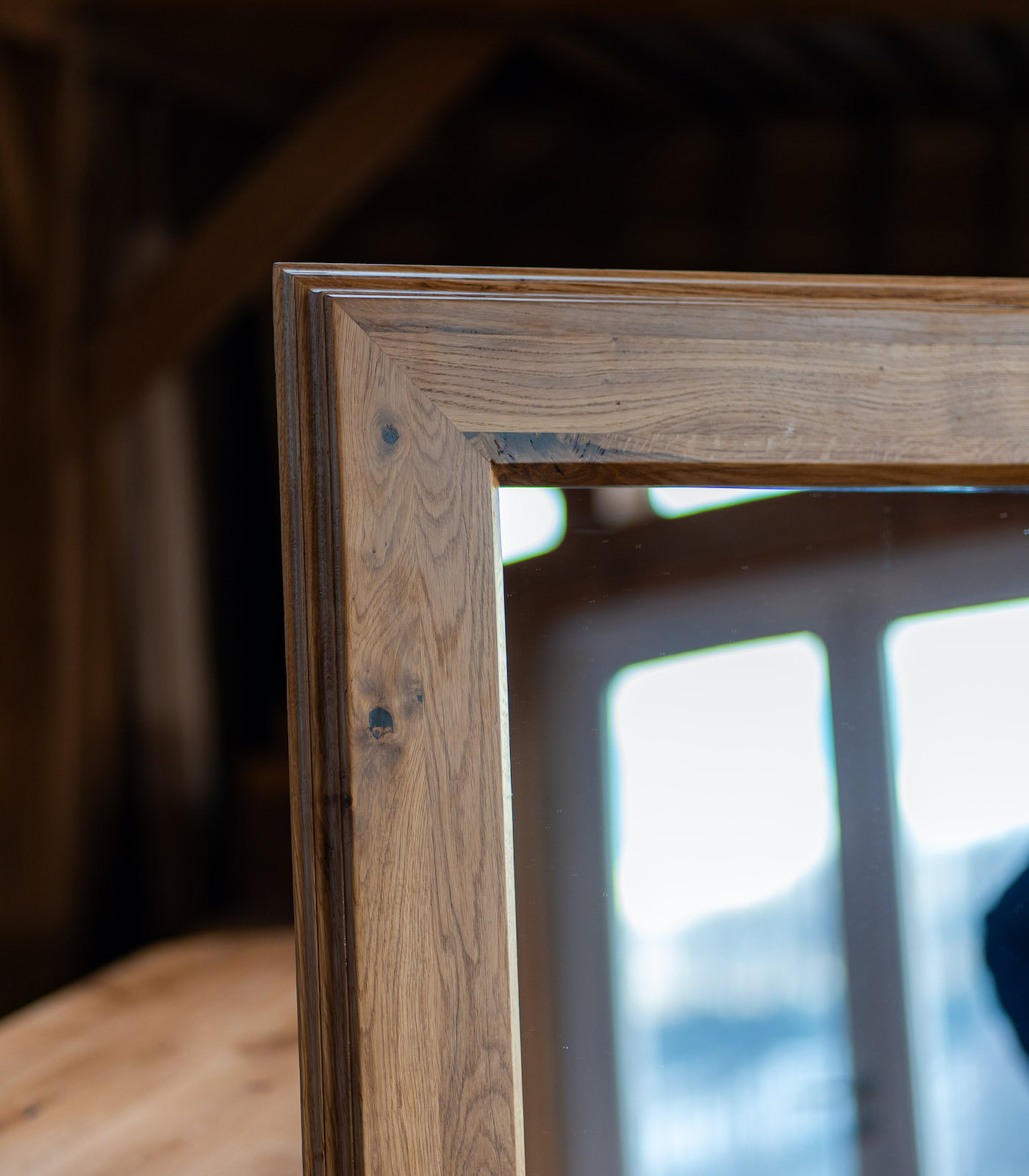Rama acestei oglinzi este sculptată din stejar selecționat, recunoscut pentru densitatea sa și pentru fibra sa inconfundabilă care „povestește” despre trecerea timpului. Grosimea de 4 cm a ramei oferă un profil tridimensional care iese în evidență pe perete, sugerând stabilitate și lux discret.