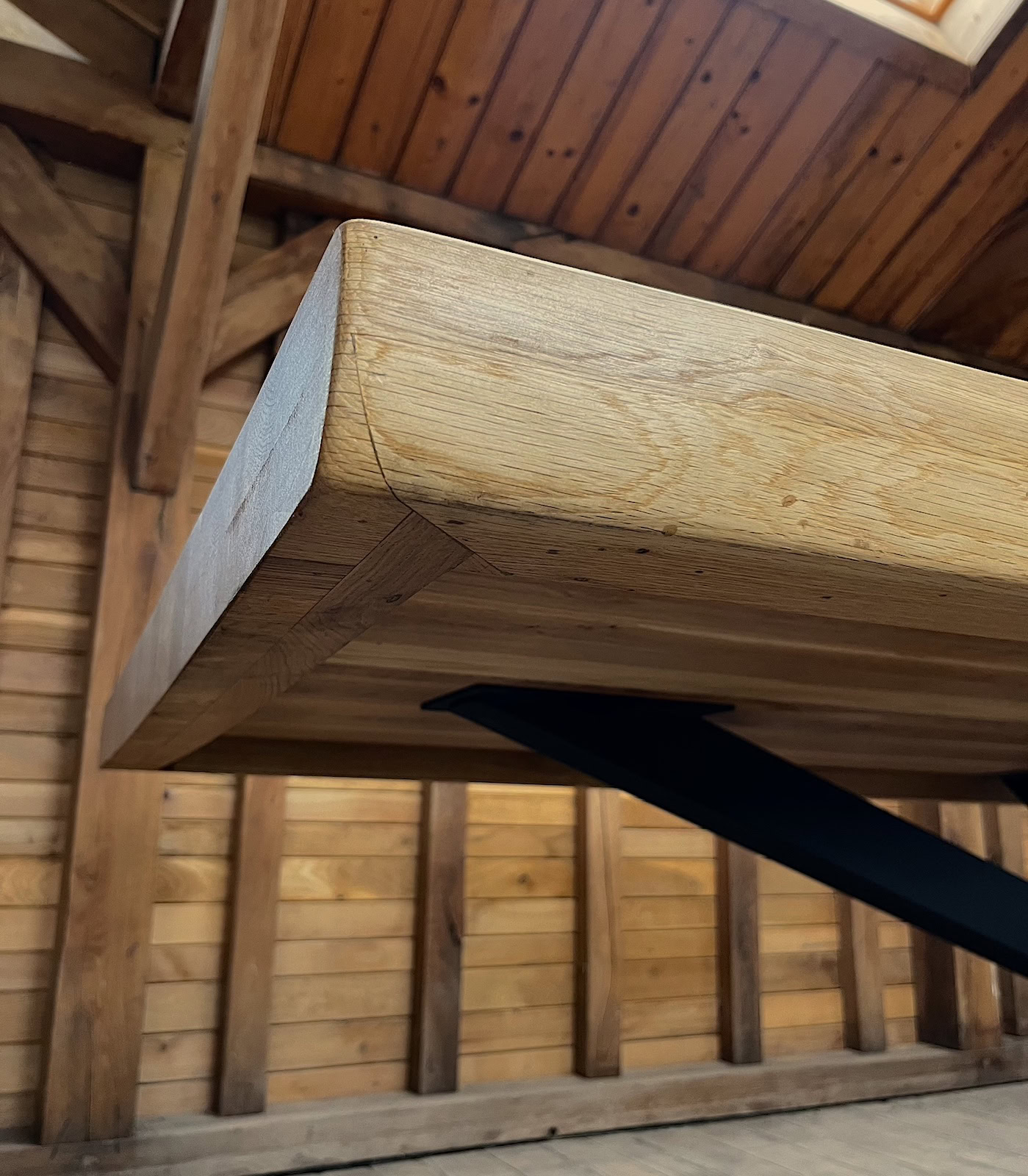 Masă de dining din stejar masiv pentru 10 persoane, cu blat dreptunghiular de 8 cm grosime și picioare metalice vopsite electrostatic. Un design contemporan ce îmbină eleganța lemnului natural cu rafinamentul detaliilor moderne.