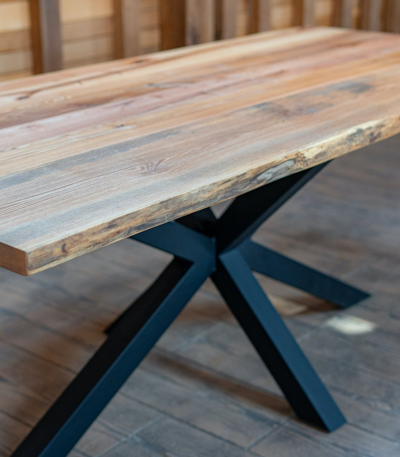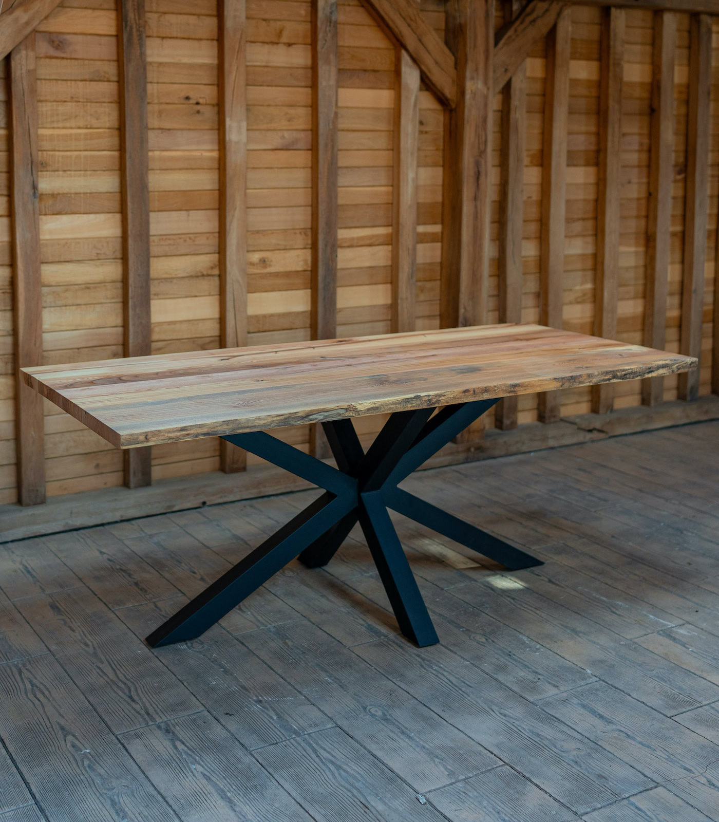 Fiecare blat păstrează conturul original al copacului (live edge), oferind o personalitate unică mesei tale. Designul este completat de piciorul metalic tip Spider, o structură geometrică ce oferă nu doar stabilitate maximă, ci și un aspect vizual sculptural, permițând în același timp așezarea facilă a scaunelor pe toate laturile.