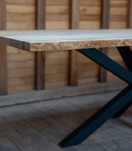 Marginile live edge păstrează forma autentică a arborelui, asigurând unicitatea fiecărei piese. Structura este susținută de baza metalică tip Spider, vopsită în câmp electrostatic (negru mat), care oferă o stabilitate excepțională și libertate totală de mișcare pentru 8 persoane.
