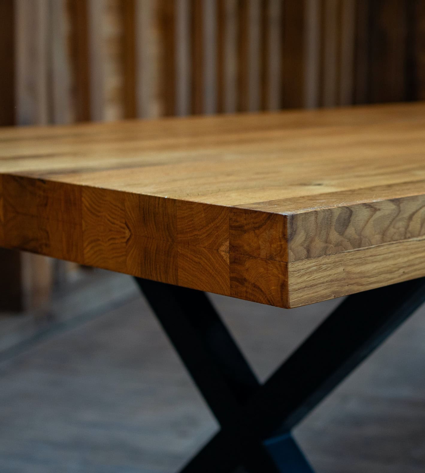 Masă de dining din stejar masiv cu margini drepte, o piesă cu proporții echilibrate, gândită pentru spații moderne și elegante. Blatul dreptunghiular de 200 × 90 cm, cu grosime dublată de 8 cm, evidențiază frumusețea naturală a lemnului, în timp ce picioarele negre adaugă un contrast subtil și contemporan.
