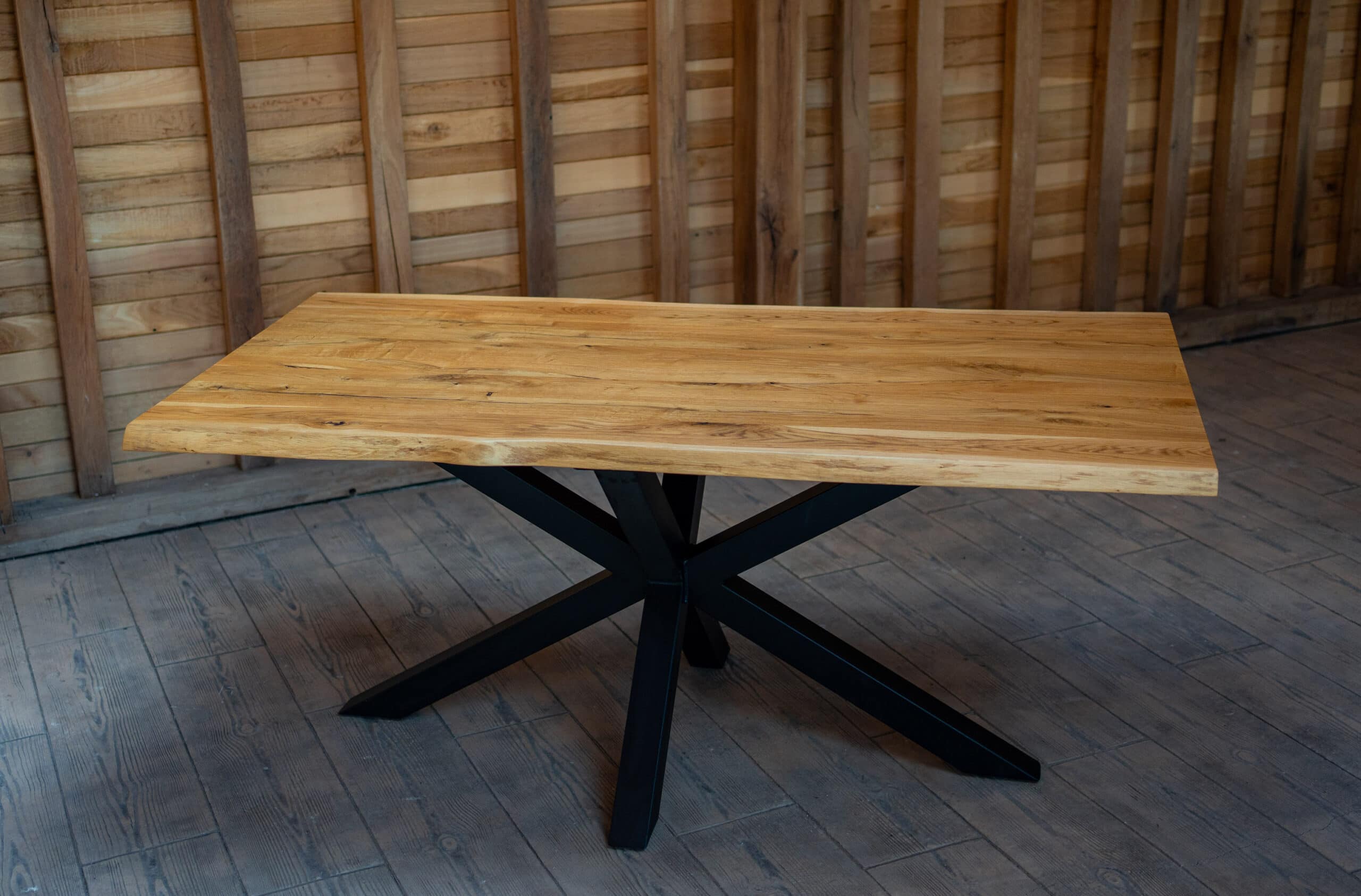 Masă de dining din stejar masiv cu finisaj natural, 180×90 cm, ideală pentru 6-8 persoane. Blatul cu margini naturale (live edge) păstrează autenticitatea lemnului, în timp ce picioarele metalice negre asigură o notă modernă și o stabilitate excelentă. O combinație perfectă între funcționalitate și design autentic.