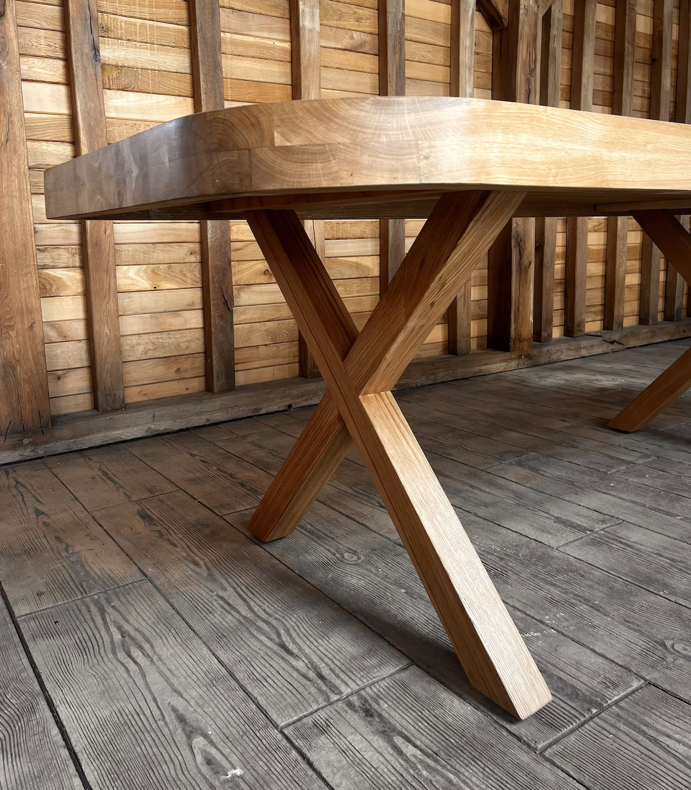 Picioarele masive, realizate tot din stejar în formă de X, susțin cu eleganță blatul grandios. Alegerea stejarului pentru întreaga structură asigură o unitate cromatică și o durabilitate de neegalat, făcând din această masă o piesă centrală care va trece proba timpului.