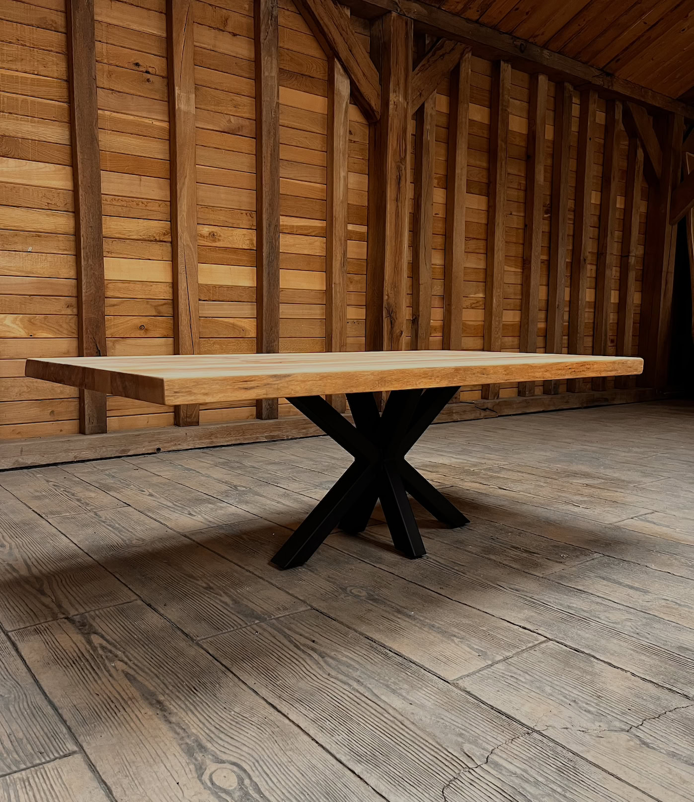 Descoperiți eleganța minimalistă. Această măsuță de cafea este realizată din lemn de fag masiv, apreciat pentru tonul său luminos și curat. Blatul robust (grosime 4 cm) de 125×70 cm este subtil îmbogățit cu mici inserții de rășină neagră, adăugând un detaliu modern și rafinat. Baza metalică stabilă tip Spider completează designul, fiind alegerea ideală pentru un spațiu luminos și aerisit.