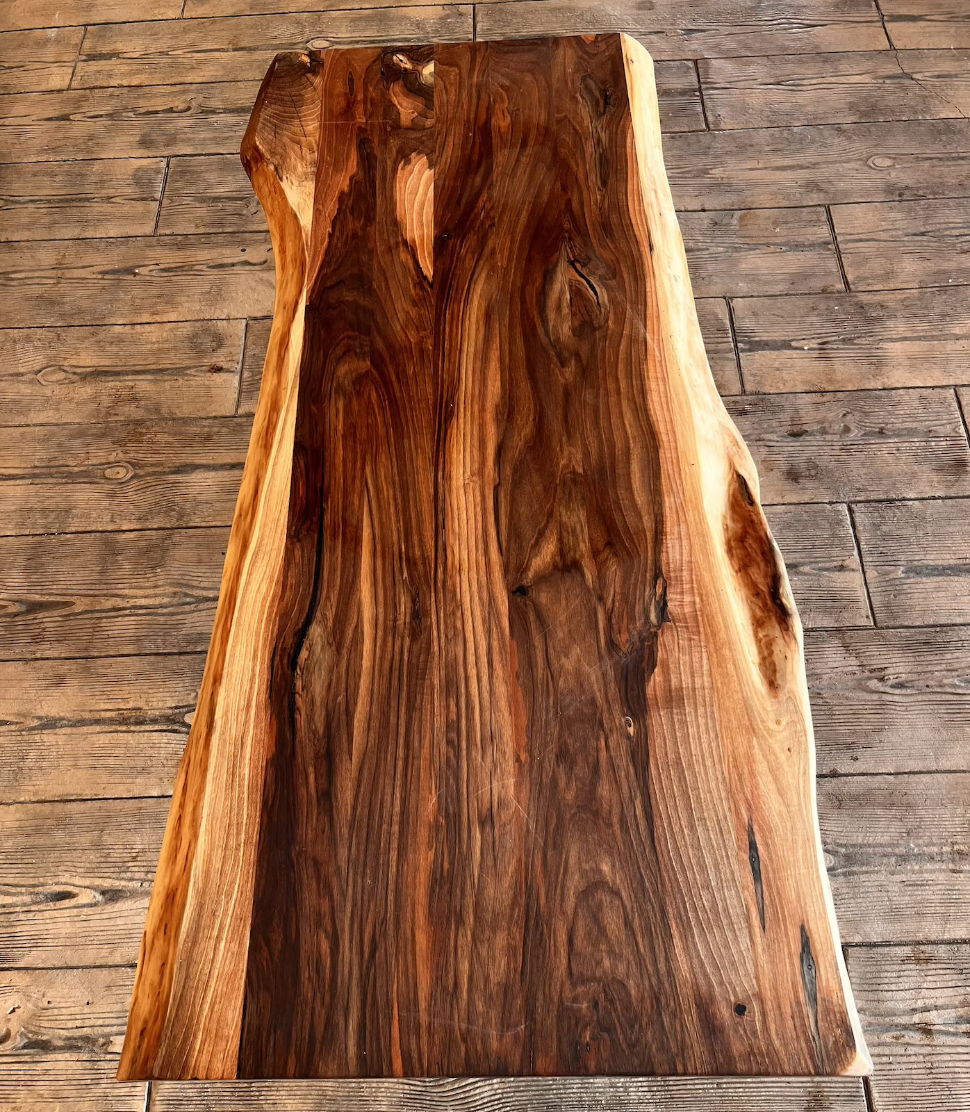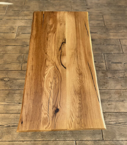 Nucul este renumit pentru fibra sa contorsionată și jocul fascinant de culori, de la ciocolatiu închis la tonuri de chihlimbar. În acest model, am ales să păstrăm marginile naturale (live edge) pentru a celebra forma originală a arborelui. Suprafața este finisată cu o atenție meticuloasă, scoțând în evidență profunzimea fibrei fără a folosi rășină, lăsând astfel lemnul să fie singura vedetă.