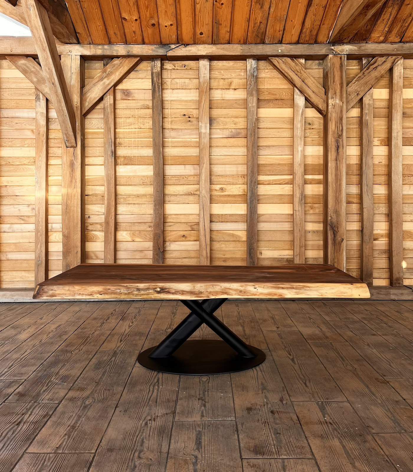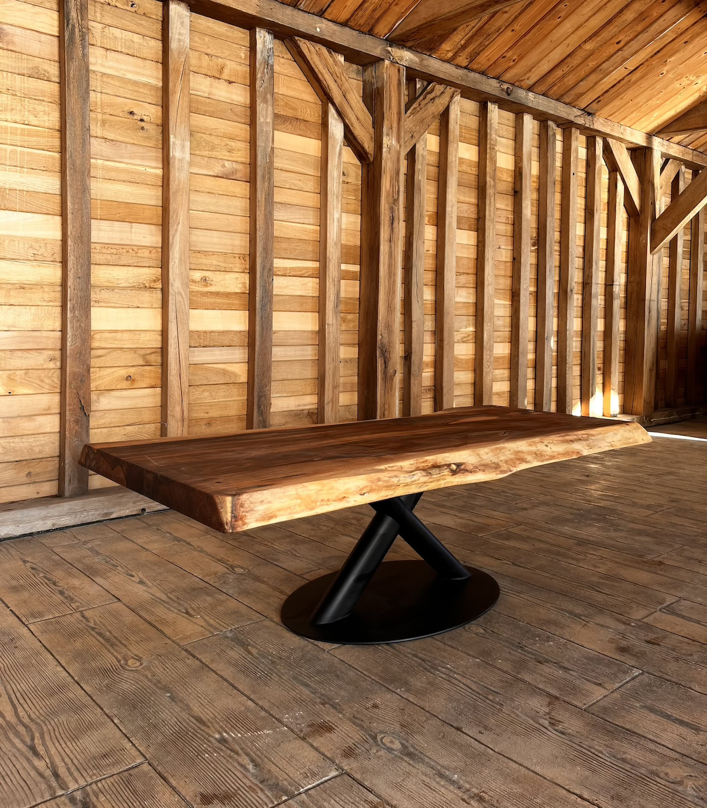 Datorită masei considerabile a blatului, această piesă este susținută de o structură metalică de înaltă rezistență, finisată în negru mat. Designul modern al bazei echilibrează aspectul robust al nucului de 6 cm, oferind o siluetă contemporană care se potrivește perfect în interioare de lux, birouri executive sau lounge-uri private.
