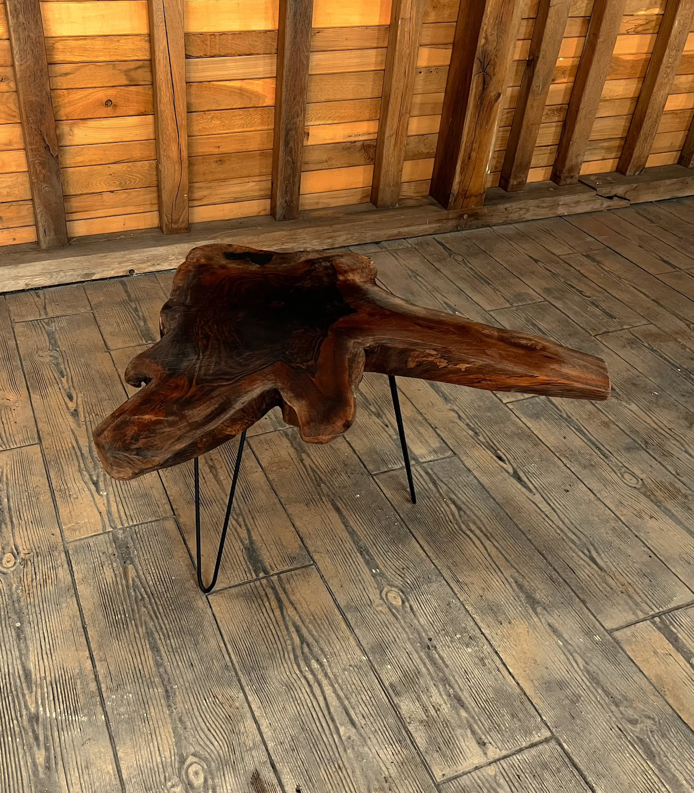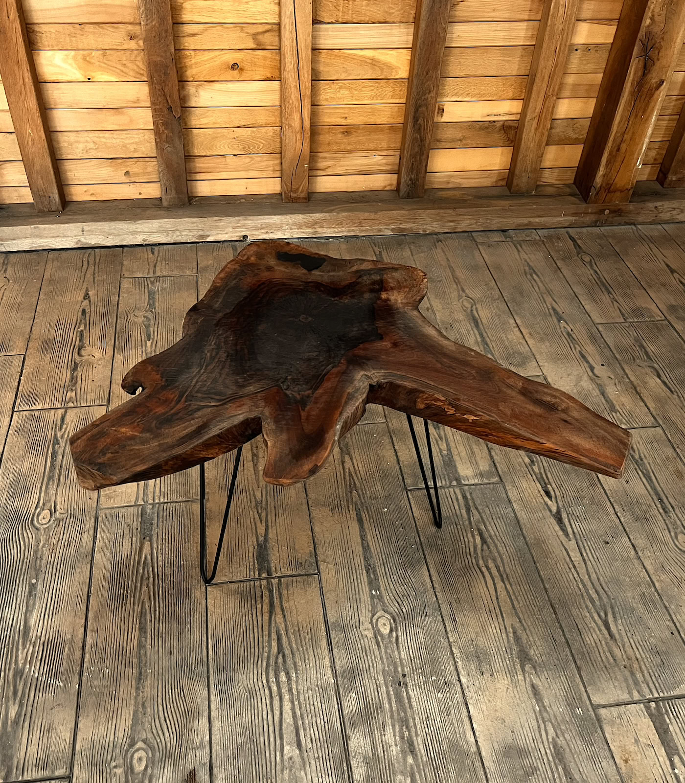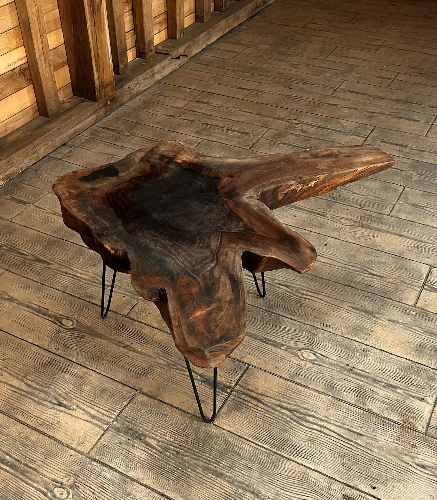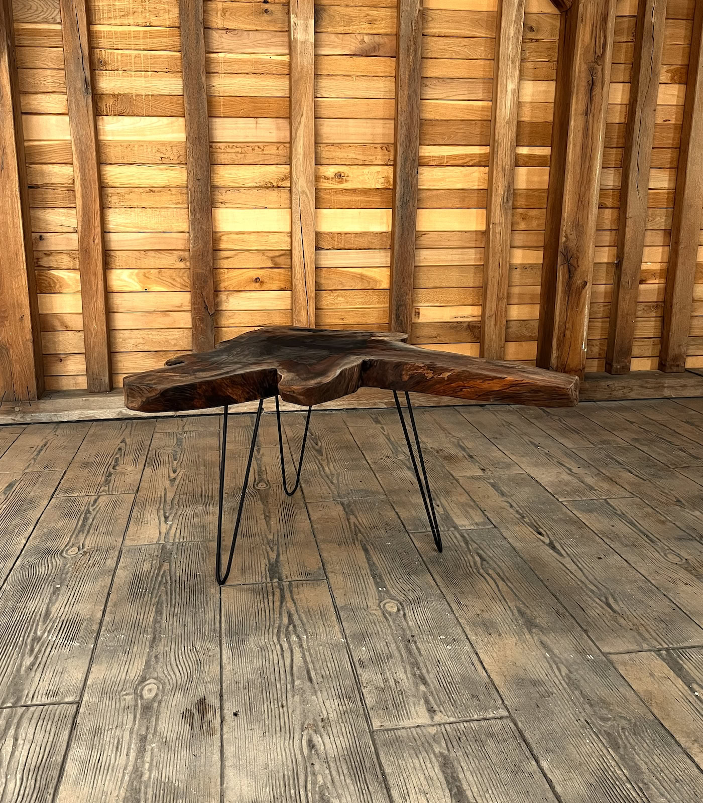 Experimentați contrastul perfect între forța brută și eleganța minimalistă. Această măsuță din nuc masiv, cu o grosime rară de 7 cm, pare să plutească grație suportului format din 3 picioare metalice de tip hairpin (sârmă groasă). Cu dimensiuni de 93×87 cm și margini naturale (live edge), piesa este o bijuterie de design organic care aduce un aer sofisticat și modern oricărui living premium.