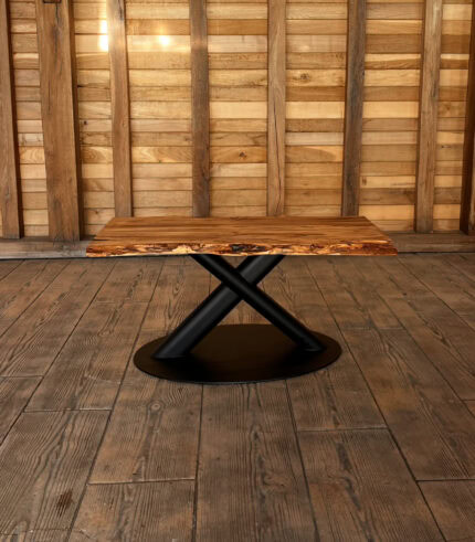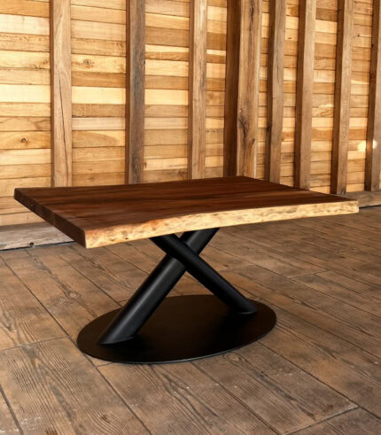Această piesă reprezintă un exercițiu de design contrastant. Vedeta incontestabilă este blatul monumental din lemn de nuc masiv, tăiat la o grosime impresionantă de 7 cm. Alegerea unui suport format din 3 picioare metalice din sârmă plină (Hairpin Heavy-Duty) oferă o stabilitate impecabilă, dar și o lejeritate vizuală care permite blatului să fie singurul punct focal.