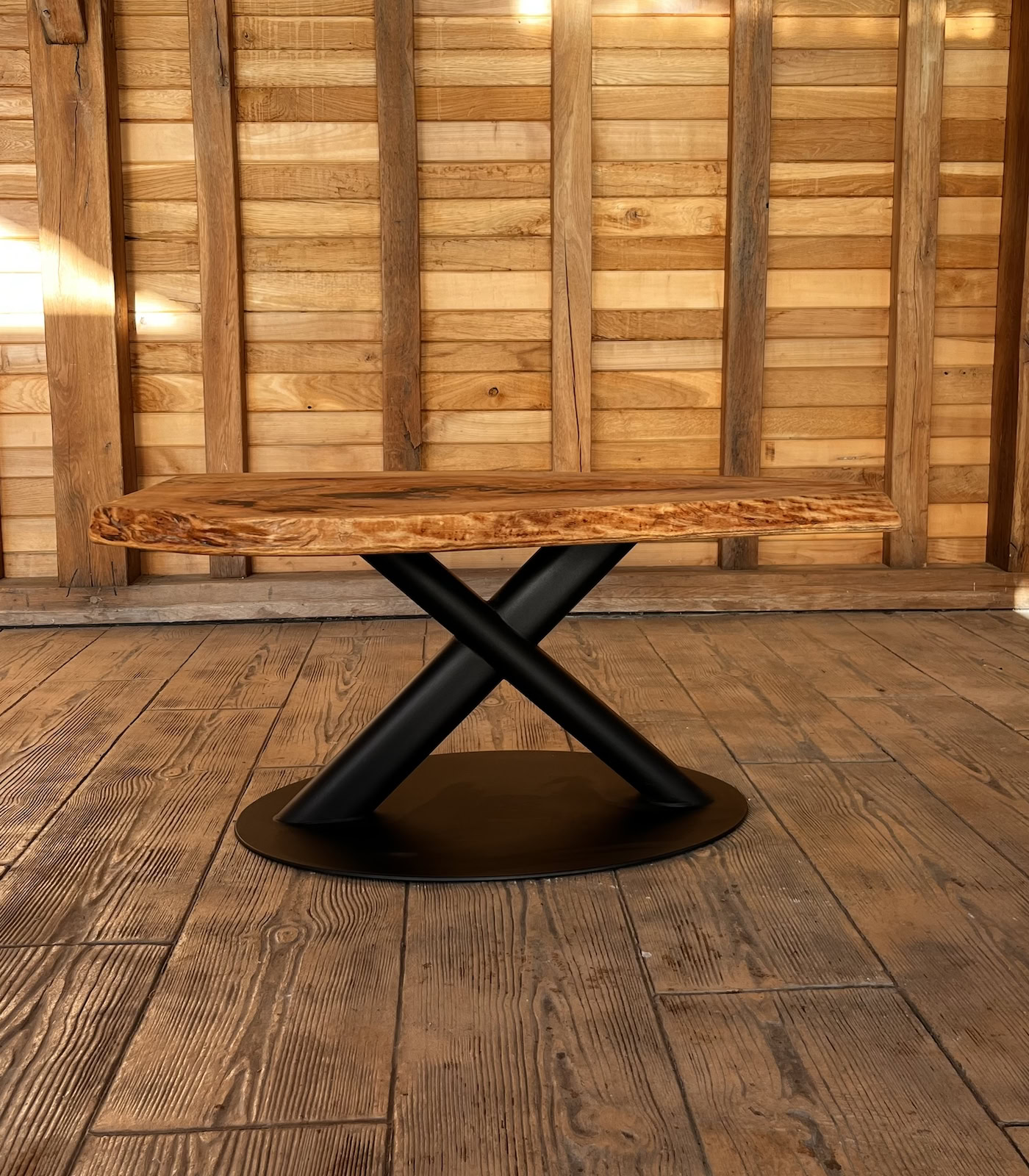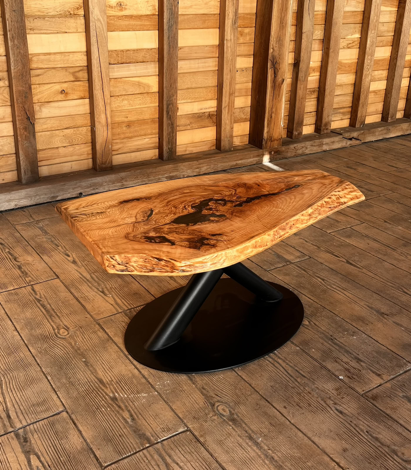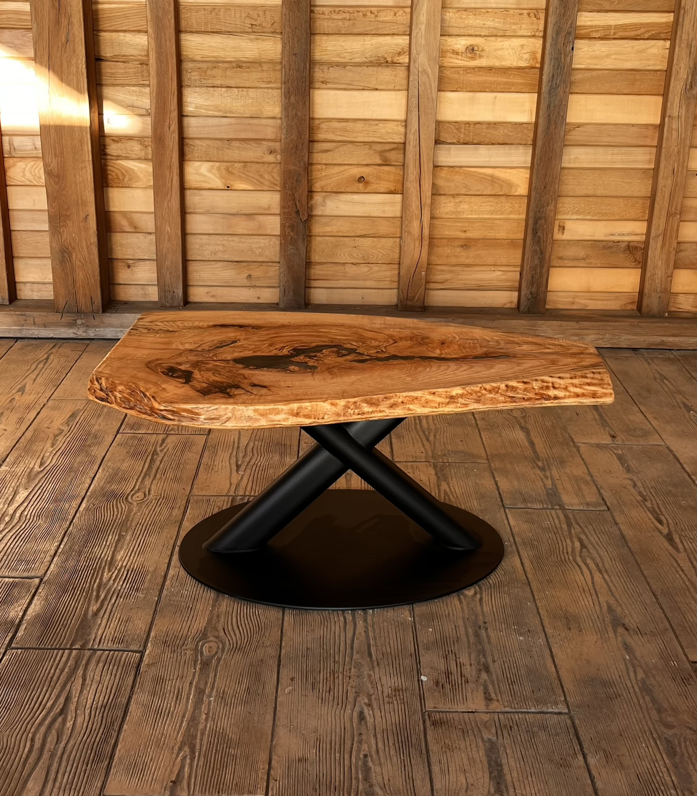 Marginile sunt lăsate în forma lor naturală (live edge), atent șlefuite pentru a fi fine la atingere, dar vizual sălbatice. Blatul este susținut de o bază metalică, vopsită în negru mat, care asigură o stabilitate perfectă și completează estetica modern-industrială.