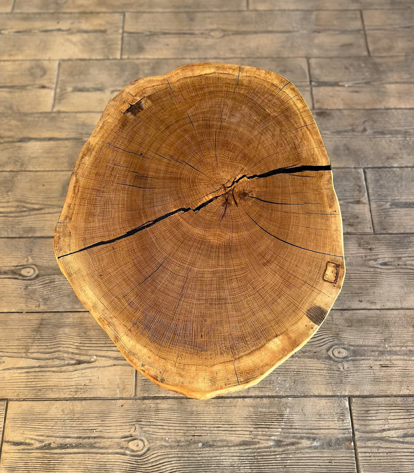 Spre deosebire de modelele unde rășina domină, această piesă mizează pe inserții subtile și discrete. Rășina epoxidică neagră este utilizată atât pentru a evidenția și proteja micile fisuri sau noduri naturale ale stejarului, cât ți pentru a creea elemente accent.
