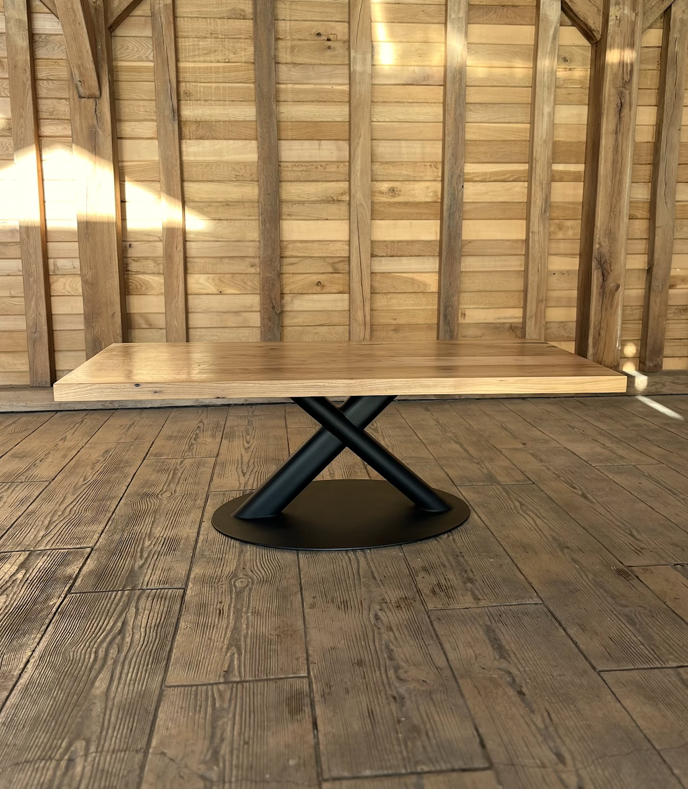 Blatul este realizat prin îmbinarea cu măiestrie a mai multor bucăți de ulm masiv, o tehnică ce asigură o stabilitate structurală impecabilă și previne tensionarea lemnului în timp. Cu o grosime solidă de 4 cm, masa emană forță și calitate, fiind finisată pentru a fi la fel de plăcută la atingere pe cât este de impresionantă vizual.