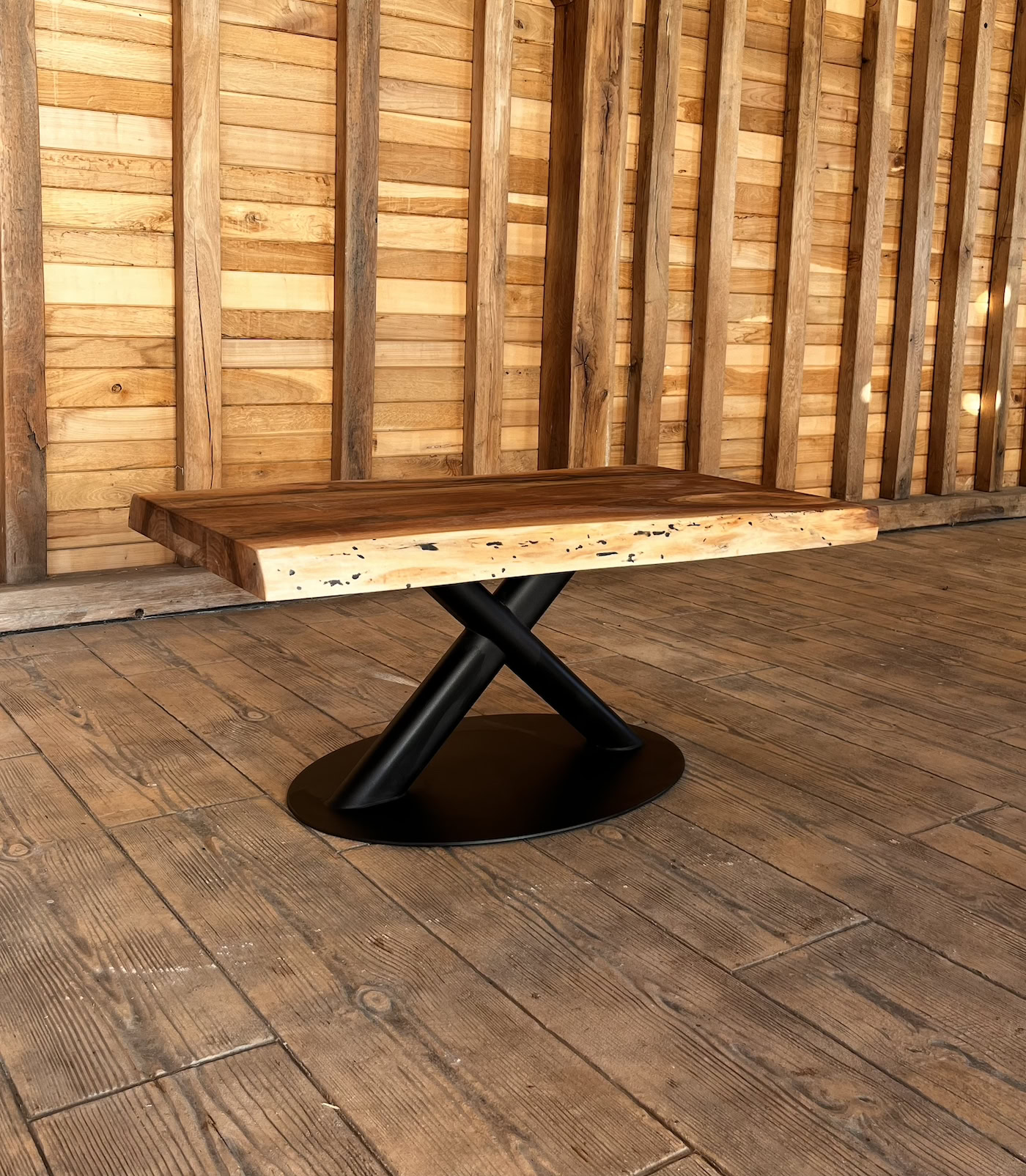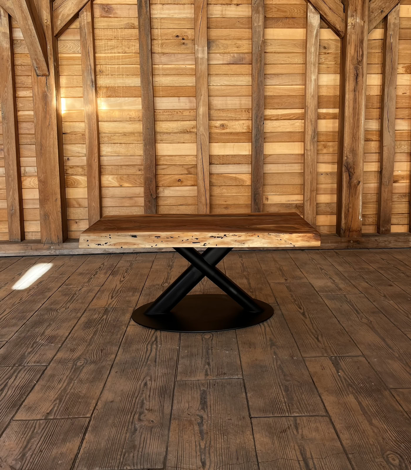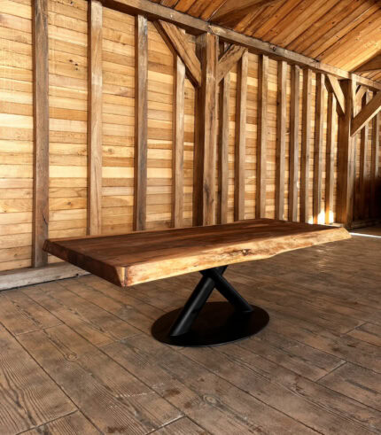 Marginile naturale (live edge) urmăresc conturul original al copacului, oferind un aspect asimetric și autentic. Această operă de artă este așezată pe o structură metalică neagră de tip „X”, oferind un suport stabil și un contrast industrial elegant care completează perfect textura caldă a nucului.