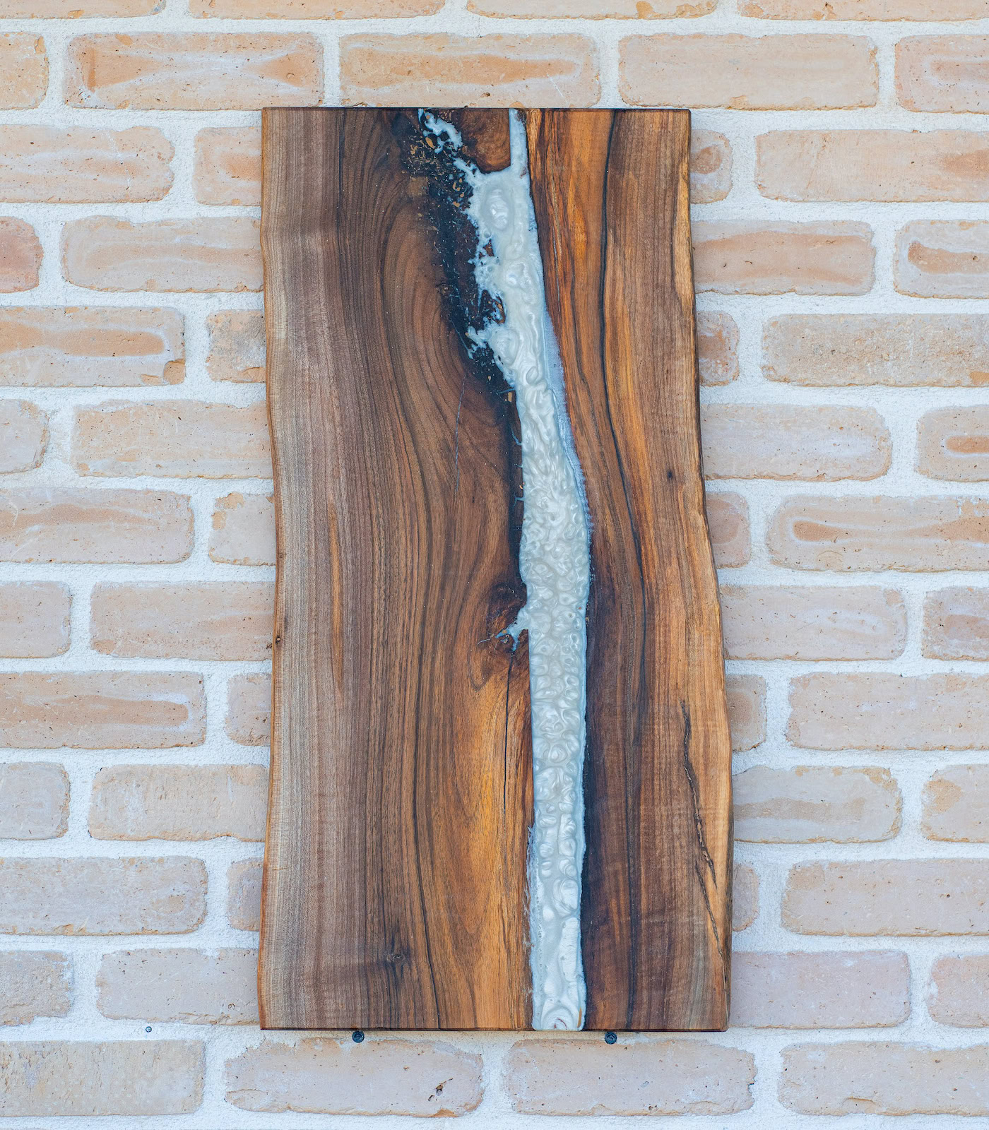 Lemnul de nuc este ales pentru textura sa densă și culorile sale profunde, de la ciocolatiu la nuanțe arămii, oferind fundalul perfect pentru inserția "river". Fiecare piesă este unică, deoarece rășina urmează conturul natural al marginilor interioare ale scândurii.