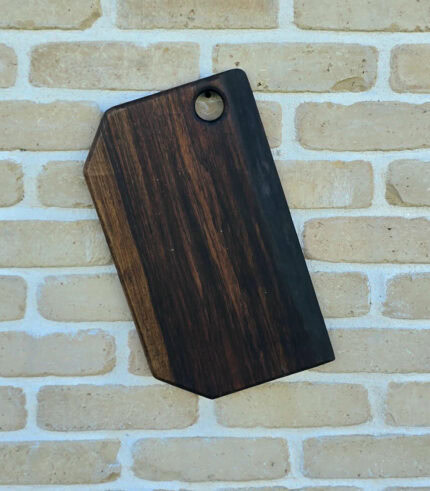 Un tocător modern care definește contrastul. Realizat din stejar masiv cu granulație naturală, se distinge prin finisajul său elegant. Colțul plin de rășină epoxidică neagră profundă stabilizează lemnul și oferă o notă minimalistă, dar puternică. Dotat cu două orificii pentru agățare sau manevrare.